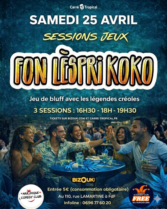Vous aimez les jeux de rôles, le bluff et les débats passionnés ? Vous allez adorer démasquer la Gran Mèr Kal, le Maskilili, le Dòwlis ou le Soukounyan ! FON LÈSPRI KOKO reprend les codes des meilleurs jeux d'ambiance en y ajoutant sa sauce créole. Les règles sont simples, les parties rapides, mais la tension est maximale. Qui de vos amis ment le mieux ? Il n'y a qu'une façon de le savoir...