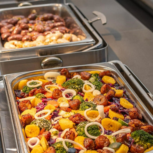 par Chef traiteur local : Déjeuner 🍲 Plats équilibrés avec crudités/racines/légumes/poisson/viande + boissons fraiches (eau & jus locaux) + boissons chaudes (café, thé, infusion) | repas en box avec couverts jetables